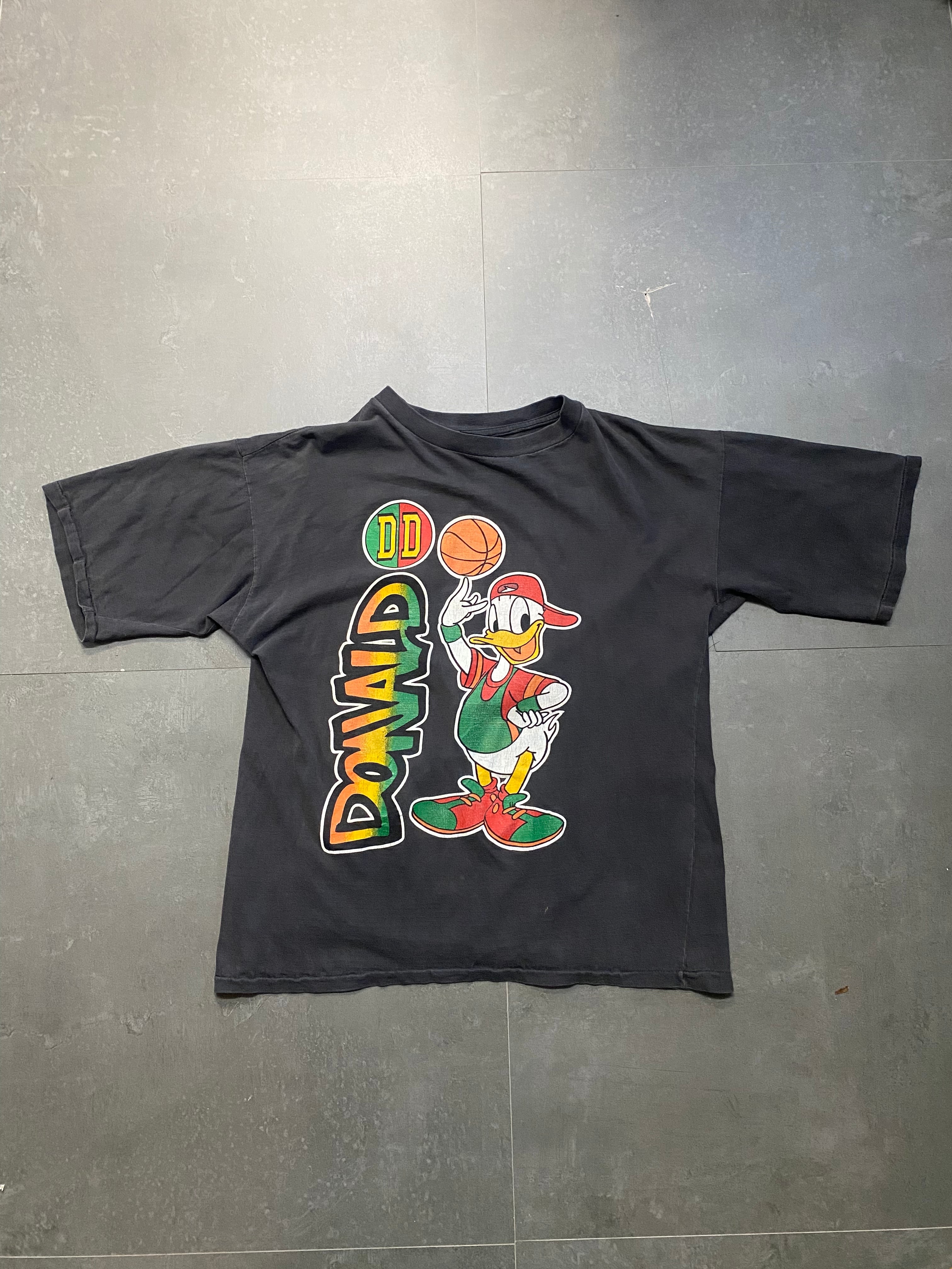90年代のディズニーデザインが存分に生かされたこのシングルステッチTシャツは、黒フェード仕上げが特徴です。